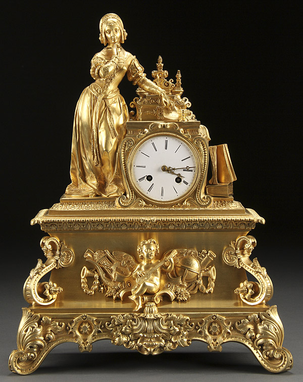 A FRENCH GILT BRONZE FIGURAL CLOCK OF THE ARTS AND SCIENCES, 19TH CENTURY. Depicting the figure of a woman at writing table mounted with a clock dial above a scrolled footed base with cherub flanked by symbolic music, arts, and science attributes. Height 18 inches (46 cm).