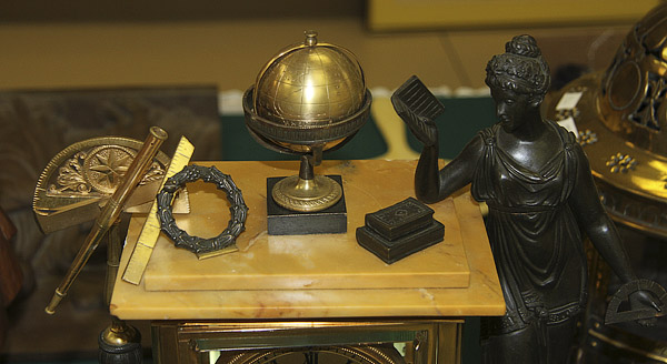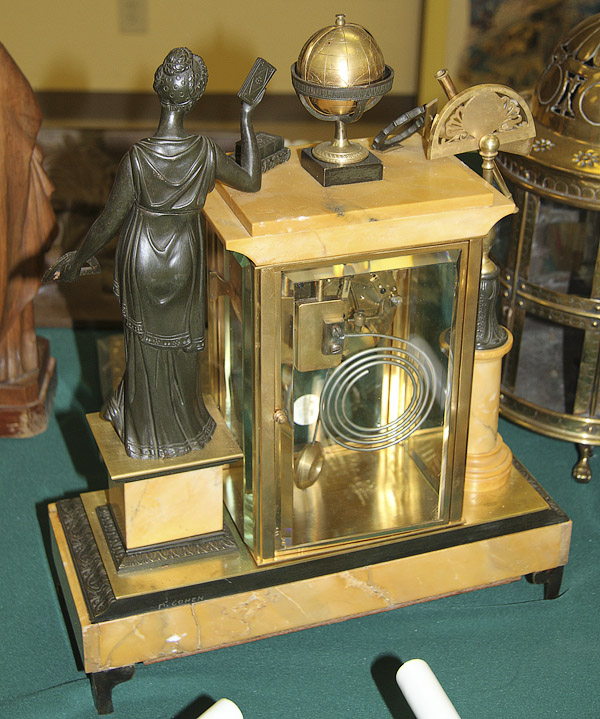 A FRENCH FIGURAL BRONZE AND CRYSTAL REGULATOR OF THE SCIENCES FOR J.E. CALDWELL & COMPANY, EARLY 20TH CENTURY. Depicting a bronze figure of a woman beside a crystal regulator flanked by an astronomical scope and surmounted with a bronze globe, the clock dial and movement marked "J.E. Caldwell & Co." Height 17.5 inches (44.5 cm).