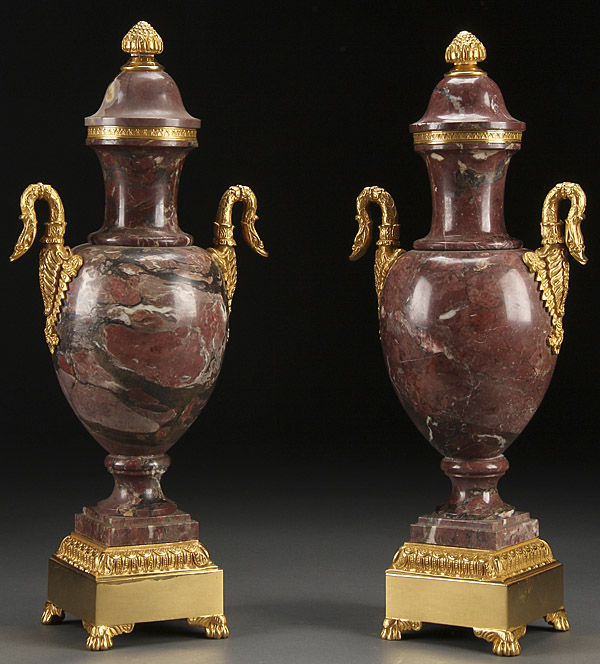 A PAIR OF FRENCH EMPIRE REVIVAL GILT BRONZE MOUNTED MARBLE URNS, 19TH/20TH CENTURY. Of ovoid form with stylized swan's head handles below a domed bolted cover with acorn finial. Height 19.5 inches (49.5 cm).