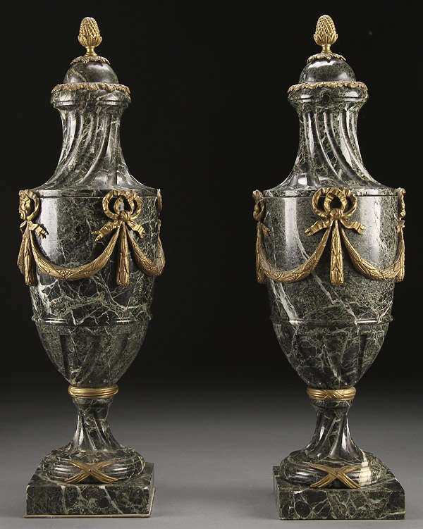 A PAIR OF LARGE FRENCH EMPIRE REVIVAL GILT BRONZE MOUNTED MARBLE URNS, 19TH CENTURY. Of elongated form below waisted collars with spiral flutes, each with bronze draped swags and pendants circling the bodies. Height 23.75 inches (60.5 cm).