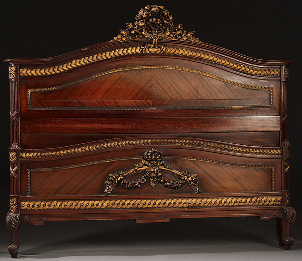 A LOUIS XVI STYLE MAHOGANY DOUBLE BED, 20TH CENTURY. With carved floral decoration and gilt lappet carved borders. Width 58 inches (147 cm), height 50 inches (127 cm).