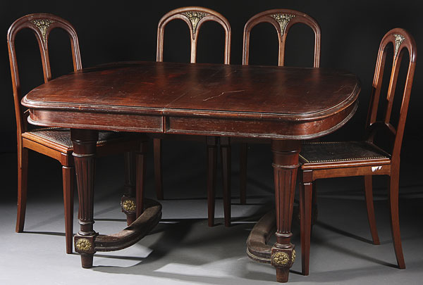A LOUIS XVI STYLE CARVED WALNUT DINING ROOM SET, EARLY 20TH CENTURY. Comprising four carved back chairs and a rectangular table raised on tapering fluted legs. 50 inches by 45 inches (127 cm x 114 cm).