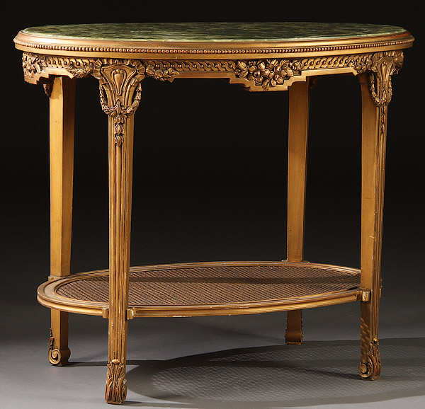 A LOUIS XVI STYLE CARVED AND GILT WOOD ONYX TOP OVAL TABLE, 20TH CENTURY With inset green onyx top above a caned lower shelf. Height 30.5 inches (78 cm), length 35 inches (89 cm), width 23.5 inches (60 cm).