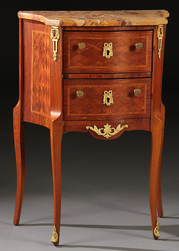 A LOUIS XIV STYLE GILT BRONZE MARQUETRY AND MARBLE END TABLE, 20TH CENTURY. With two serpentine drawers. Height 30 inches (76 cm), width 21 inches (53 cm), depth 11 inches (28 cm).