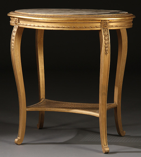 A FRENCH LOUIS XIV STYLE GILT WOOD MARBLE TOP OVAL LAMP TABLE, 20TH CENTURY. With saber form legs decorated with bell flower pendants. Height 30.5 inches (78 cm), width 30 inches (76 cm), depth 21.5 inches (54.6 cm).