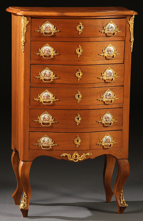 A FRENCH LOUIS XV STYLE SPELTER AND PORCELAIN MOUNTED WALNUT LINGERIE CHEST, LAST HALF 20TH CENTURY. With six bow front drawers decorated with spelter and scenic porcelain mounted handles. Height 33 inches (84 cm), width 20 inches (51 cm), depth 13 inches (33 cm).