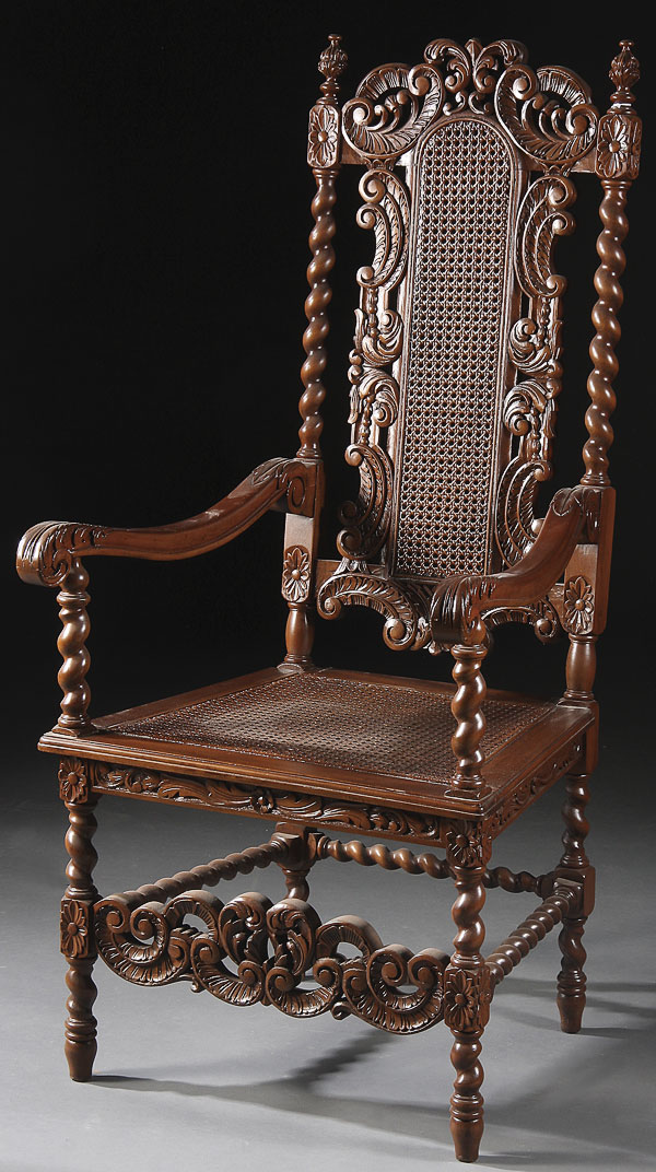 A JACOBEAN STYLE CARVED WOOD ARMCHAIR, 20TH CENTURY. With acanthus and C scroll carved openwork back supported by barley twist columns containing woven seat and back panel. Height 51.5 inches (131 cm), width 24.25 inches (61.5 cm), depth 22 inches (56 cm).