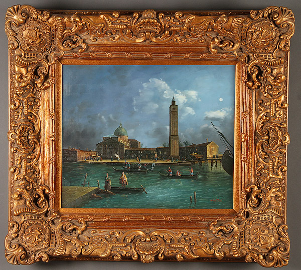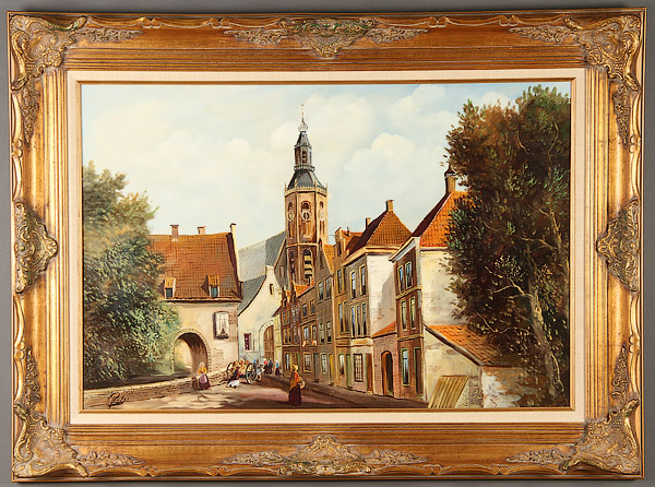 A PAIR OF EUROPEAN OIL PAINTINGS DEPICTING VENICE AND A DUTCH CITY, 20TH CENTURY. Comprising a Venetian view at dusk, oil on canvas, signed lower right "Walton”, 20 inches x 24 inches (50.8 x 60.9 cm); and a Dutch city scene, signed lower left “E. Pater for Evert Jan Pater (Dutch b. 1930- ) oil on canvas, 24 inches x 36 inches (60.9 x 91.4 cm). Both in attractive gilt frames.