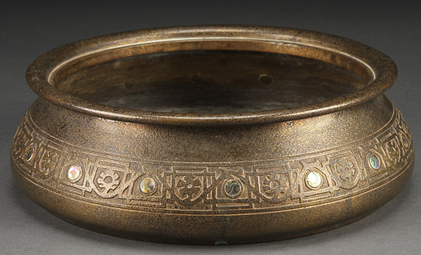 A TIFFANY STUDIOS ABALONE PLANTER, CIRCA 1900. Lid absent, minor dent and loss. Stamped "Tiffany Studios, New York 1729." Diameter 9 inches (23 cm).