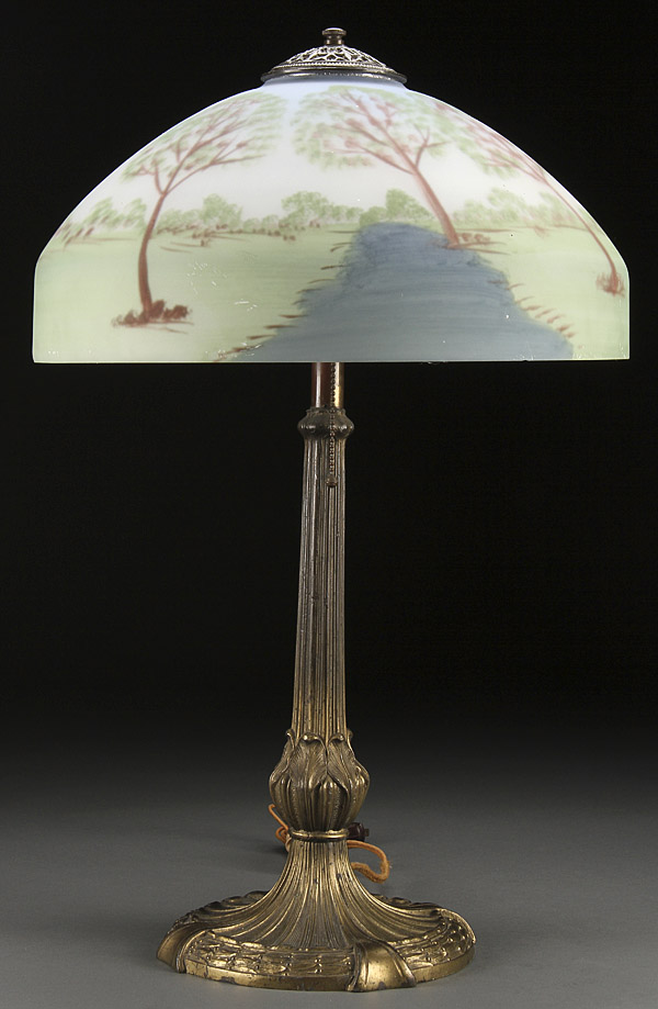 A REVERSE SCENIC PAINTED GLASS TABLE LAMP, EARLY 20TH CENTURY, PROBABLY BY JEFFERSON. With satin finished shade painted on the interior with tall trees and a stream raised on an embossed metal base with bronzed finish. Height 24.5 inches (62 cm).
