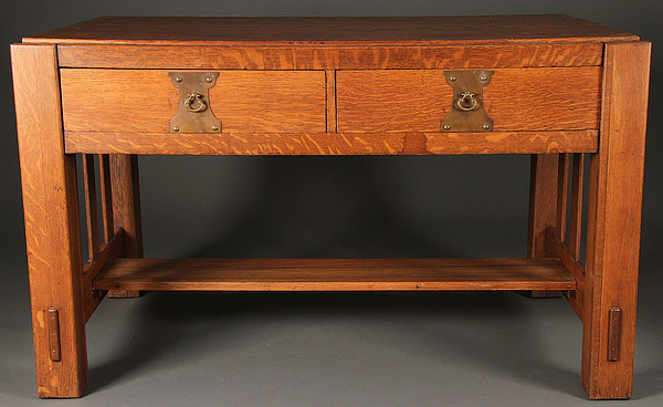 AN IMPERIAL ARTS AND CRAFTS LIBRARY TABLE, CIRCA 1905. Two drawers, with slatted sides and broad lower shelf. Width 49 inches, depth 32 inches, height 30 inches (124.5 x 81.3 x 76.2 cm).