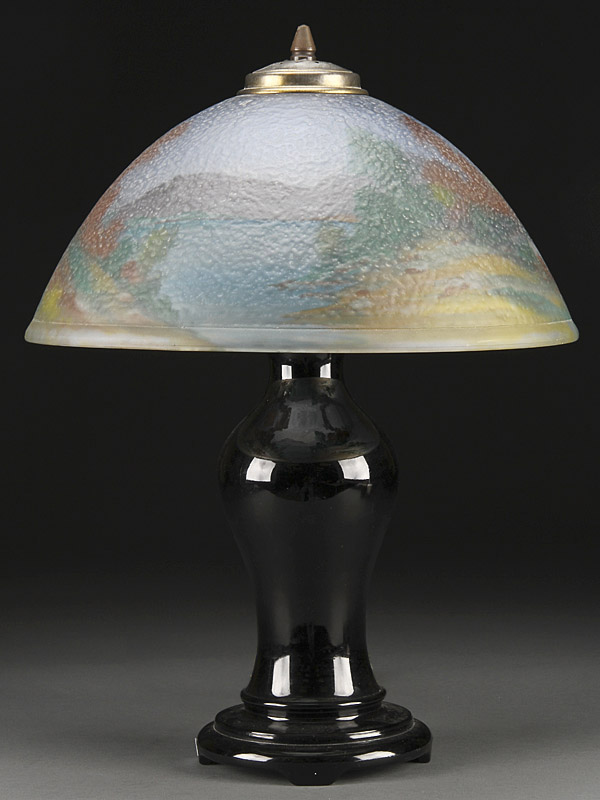 A VINTAGE SCENIC REVERSE PAINTED GLASS TABLE LAMP, EARLY 20TH CENTURY. Depicting a mountainous lake scene with trees and cottage above a baluster form black glass lamp base. Height 21.75 inches (55 cm), diameter 16 inches (40.5 cm).