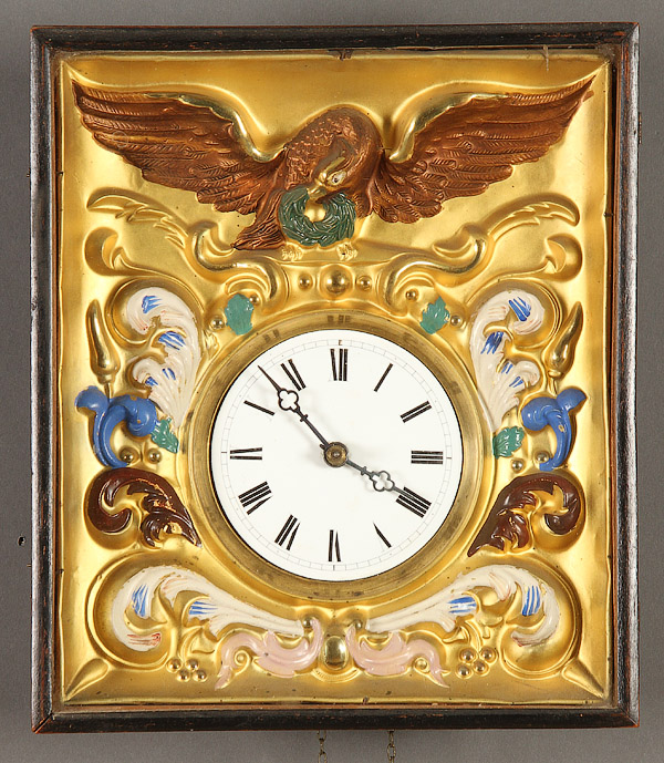 TWO 19TH CENTURY CLOCKS. Comprising a Black Forest picture frame clock with embossed polychrome and gilt metal relief panel of an eagle, 13 inches x 11 inches (33.2 x 27.9 cm). Together with an early American Forestville mahogany ogee clock with eight day movement and chimes, 30.75 inches x 17.25 inches.