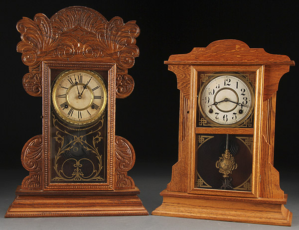 A GOOD PAIR OF VICTORIAN OAK KITCHEN CLOCKS, CIRCA 1900. Comprising an "Aldrich" Waterbury with ornate pressed designs, height 22 inches (56 cm) and an Ingraham, both with chimes.