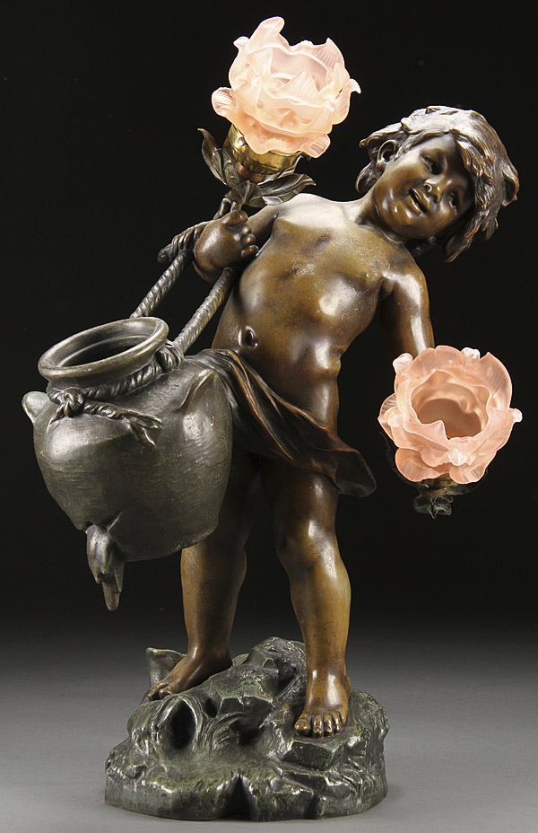 AFTER AUGUSTE MOREAU, A FIGURAL PARLOR LAMP OF AN INFANT WATER CARRIER, EARLY 20TH CENTURY. Cast metal with bronzed finish displaying two floriform lamps with petal form glass shades, signed on base "Auguste Moreau" with foundry stamp. Height 26 inches (66 cm).