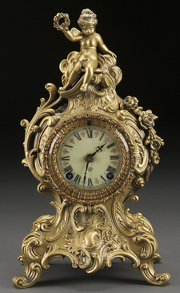 AN ANSONIA GILT ROCOCO REVIVAL TABLE CLOCK, LATE 19TH CENTURY. With figure of a nymph atop a Rococo scrolled case, later painted gilt finish. Height 12.75 inches (32.5 cm).
