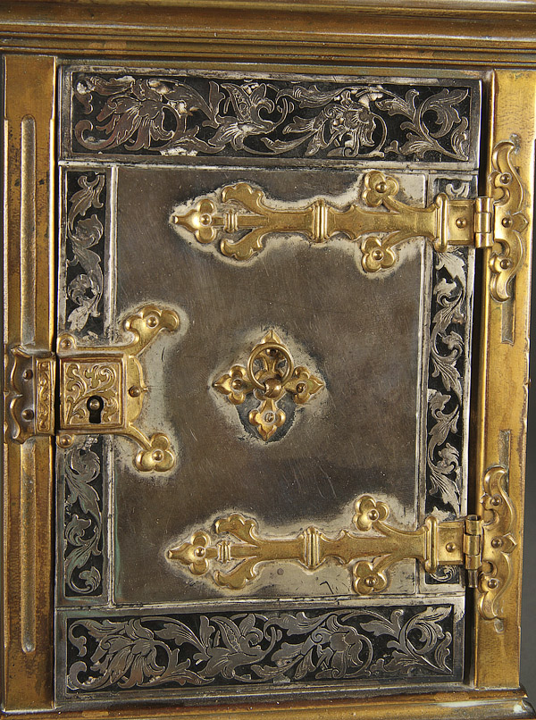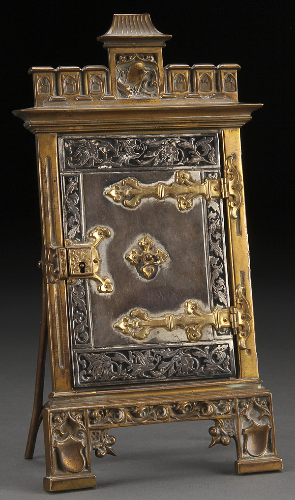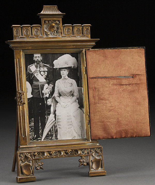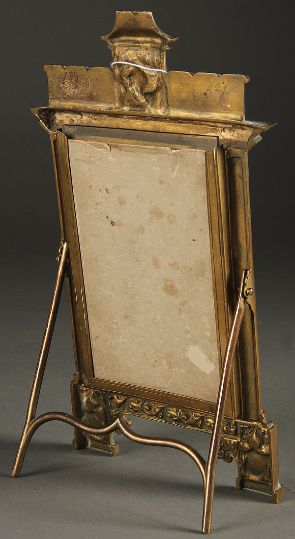 AN ENGLISH ARTS AND CRAFTS GILT BRONZE, SILVERED AND ENAMELED PICTURE FRAME, EARLY 20TH CENTURY. Of architectural free standing form with hinged door/locking cover opening to reveal a glazed panel for photograph. Apparently unmarked. Height 11.25 inches (28.5 cm). Display window 5.875 inches X 3.875 inches (15 x 10 cm).