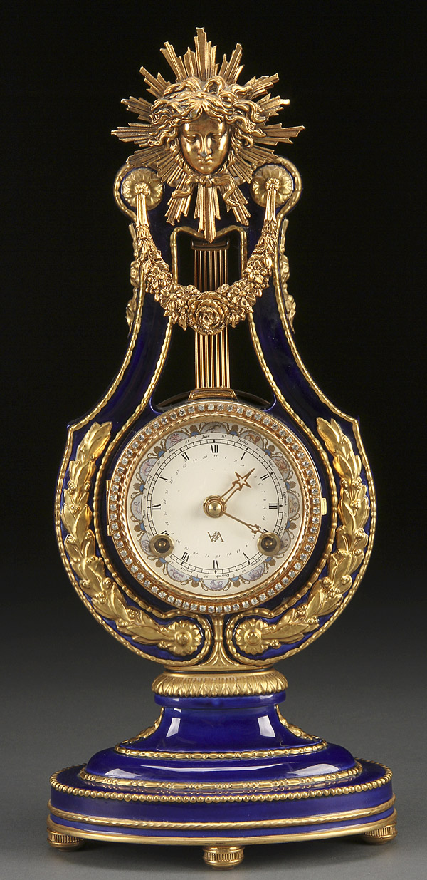 A FRENCH EMPIRE STYLE PORCELAIN AND GILT METAL MOUNTED LYRE CLOCK, LAST HALF 20TH CENTURY. In cobalt blue glazed porcelain with jeweled bezel and striking movement, marked V & M. Height 15.25 inches (38.5 cm).