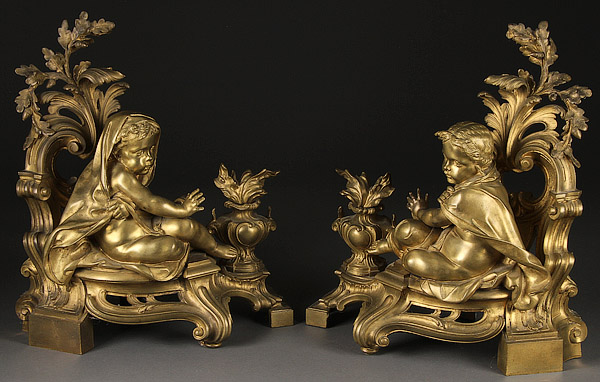 A GOOD PAIR OF FRENCH LOUIS XV STYLE GILT BRONZE FIGURAL CHENETS, EARLY TO MID 19TH CENTURY. Each depicting a young pair of infants warming themselves beside a flaming urn against a scrolled acanthus backdrop. Height 18.5 inches (47.5 cm).