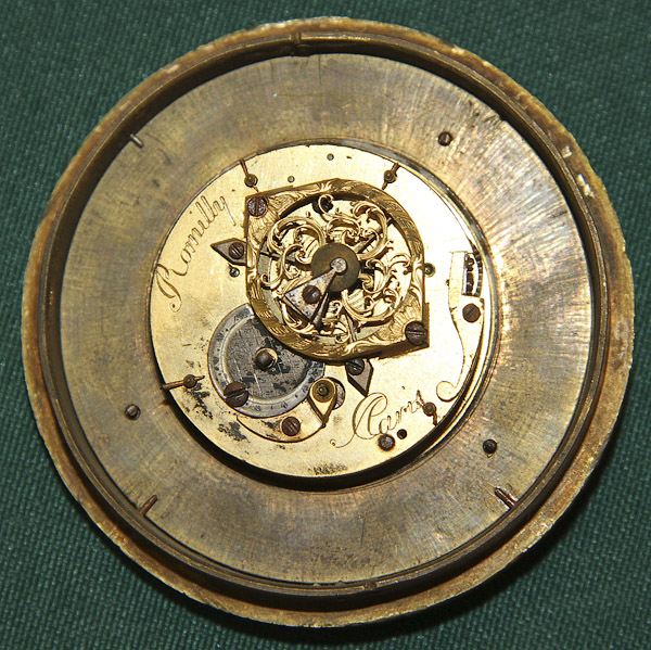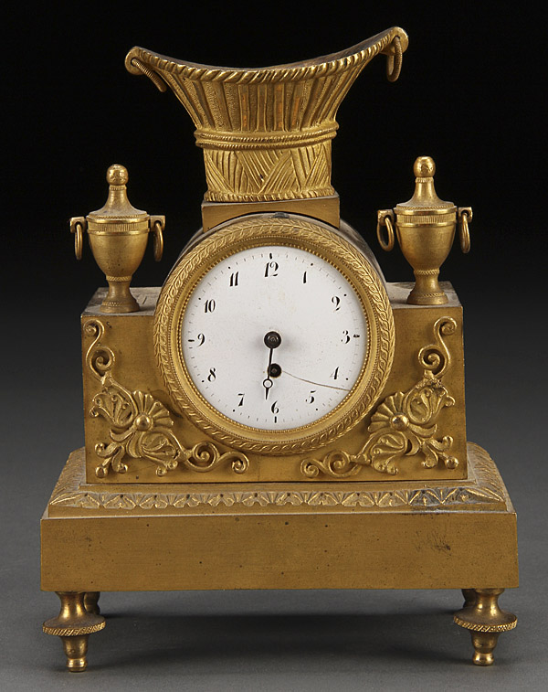 A FRENCH ORMOLU RESTORATION PERIOD DESK CLOCK, CIRCA 1800. With floral basket finial below a "Romilly Paris" movement, some losses. Height 6.25 inches (15.5 cm).