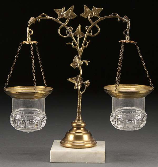 A VICTORIAN GILT BRONZE AND CRYSTAL DOUBLE FAIRY LAMP. Suspended by a scrolled grapevine support. Height 10.75 inches (27 cm).