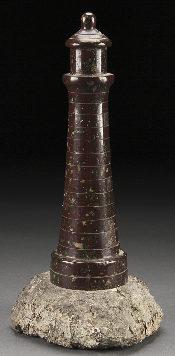 AN ENGLISH SPECIMEN MARBLE ORNAMENT OF A LIGHTHOUSE, 19TH CENTURY. In deep rouge colored marble with green/tan mottling raised on a rockery plinth. Height 11.75 inches (29.5 cm).