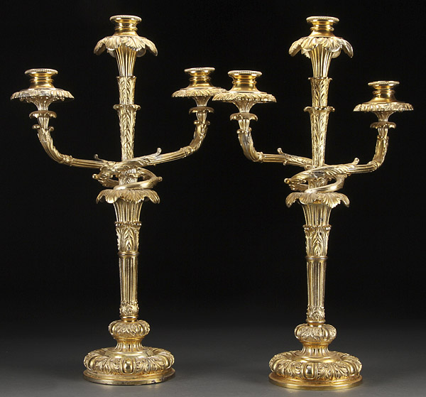 A PAIR OF FRENCH LOUIS XVI STYLE GILT METAL CANDELABRA, 20TH CENTURY. Each with two scrolling candle arms below a central candle stem with spreading acanthus terminal, originally electrified. Height 23.25 inches (59 cm).