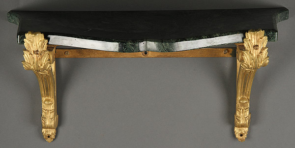 A FINE LOUIS XVI GILT BRONZE AND MARBLE WALL SHELF, 20TH CENTURY. With scrolled acanthus supports below a scalloped green marble shelf. Length 22 inches (56 cm).