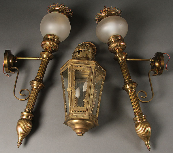 A PAIR OF CONTEMPORARY BRASS AND FROSTED GLASS EXTERIOR ENTRY WALL SCONCES. Of fluted torched form with squat bulbous globes and reticulated heat caps, length 35 inches (89 cm), together with an electric brass lantern.