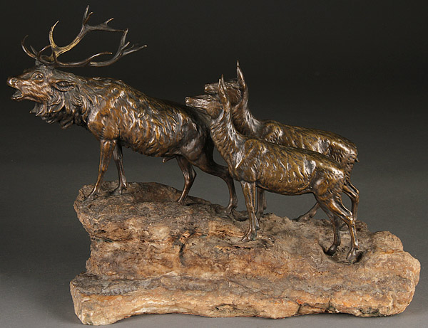 A FRENCH 19TH CENTURY BRONZE GROUPING OF AN ELK WITH TWO CALVES ON A ROCKERY BASE. Apparently unsigned, 12 inches x 16.5 inches (30.5 x 41.9 cm).