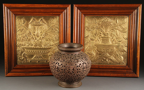 A PAIR OF VICTORIAN RENAISSANCE REVIVAL GILT BRONZE PLAQUES, PROBABLY LATE 19TH CENTURY. Each raised on rouge marble plinths and inscribed "Aug. Moreau.". Height 7 inches and 7.25 inches. Each sculpted in relief with mythical beasts and floral urns contained in walnut frames together with a contemporary Sino-Tibetan reticulated bronze vase. The plaques 12.5 inches x 11.25 inches (32 x 28.5 cm) and 17.5 inches x 16 inches overall (44.5 x 40.5 cm).