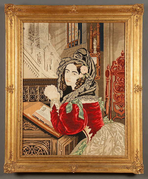 A VICTORIAN NEEDLEWORK PICTURE DEPICTING A WOMAN IN PRAYER AT A GOTHIC STYLE ALTAR. Contained in an embossed gilt frame. 25.5 inches x 32.5 inches (65 x 82.5 cm)