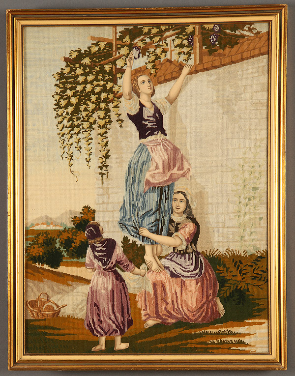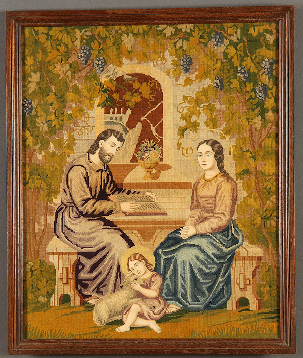 A PAIR OF VICTORIAN NEEDLEPOINT AND PAPER LITHO PICTURES, 19TH CENTURY. Depicting the Holy Family in a garden setting and women stealing grapes. The largest 20.5 inches x 17 inches.