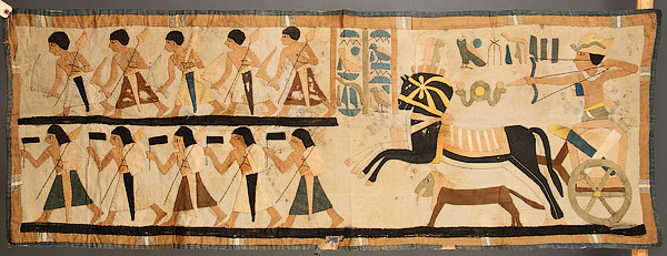 AN EGYPTIAN REVIVAL ART DECO QUILTED PANEL, CIRCA 1920. Depicting a warrior pharaoh on chariot and soldiers. 26 inches x 69 inches (66 x 175 cm).