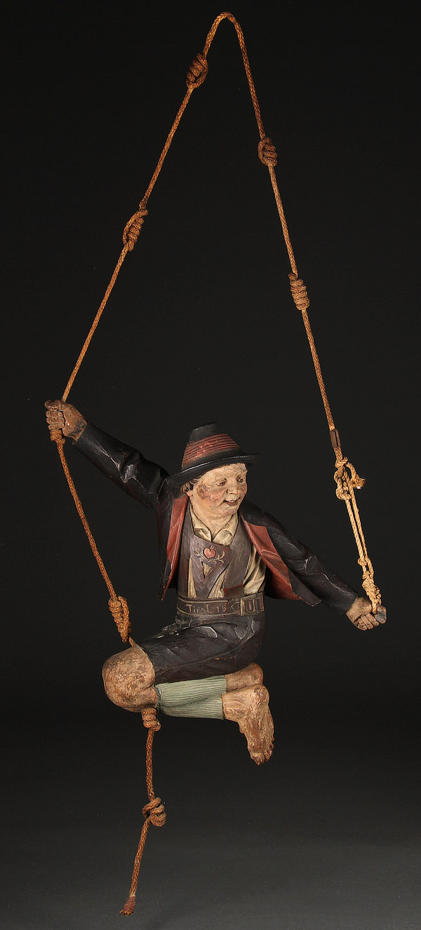 A VERY FINE GERMAN CARVED AND POLYCHROME WOOD STOREFRONT WINDOW DISPLAY FIGURE, LATE 19TH CENTURY. In the form of a Tyrolean boy swinging from a rope. The belt inscribed "Tyrol 15." The figure 19 inches high (48.15 cm), overall length 35 inches (89 cm).