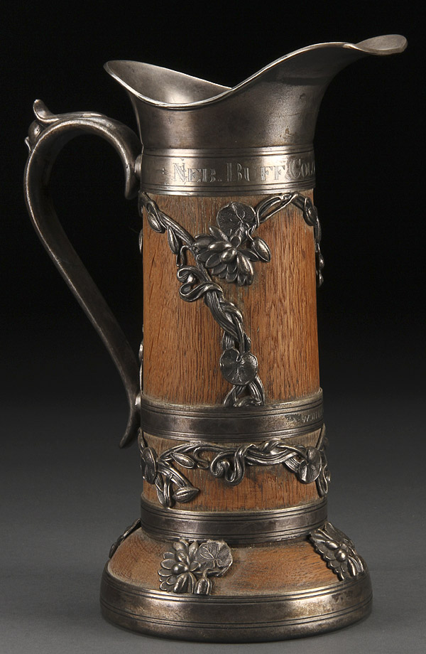 AN OAK AND QUADRUPLE PLATE PRESENTATION TANKARD, LATE 19TH CENTURY. The turned oak cylinder with silvered metal applied decoration, handle and flared lip. For the "Neb. Buff Color Cup Association" (poultry). Height 11 inches (28 cm).