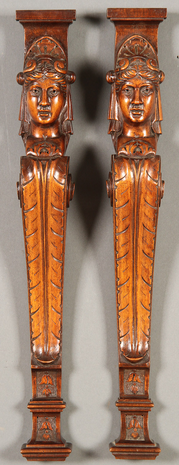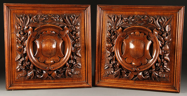 A VERY FINE PAIR OF SWISS CARVED BLACK FOREST CABINET PANELS, CIRCA 1900. Each carved with large cartouches and floral wreaths in deep relief, later mounted as wall plaques together with a pair of carved walnut figural supports, 20.75 inches square (52.7 cm).