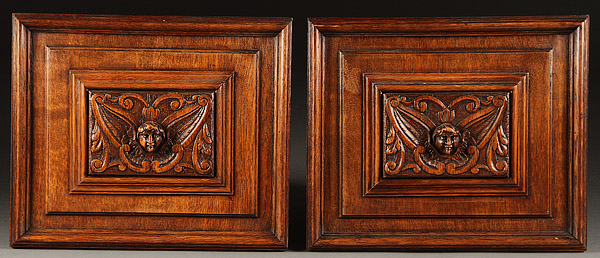 A FINE PAIR OF SWISS CARVED BLACK FOREST WINGED CHERUBS HEAD OAK PANELS, CIRCA 1900. With an extending facial mask set within stepped molded borders, later mounted as wall plaques, 12.75 inches x 15 inches (32.4 x 38.1 cm).