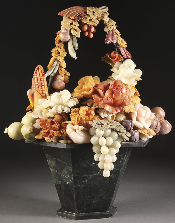 A LARGE ITALIANATE POLYCHROME CARVED SOAPSTONE FLORAL ARRANGEMENT, 20TH CENTURY. Sculpted as a handled basket overflowing with carved fruits and floral blossoms. Height 25 inches (63.5 cm).