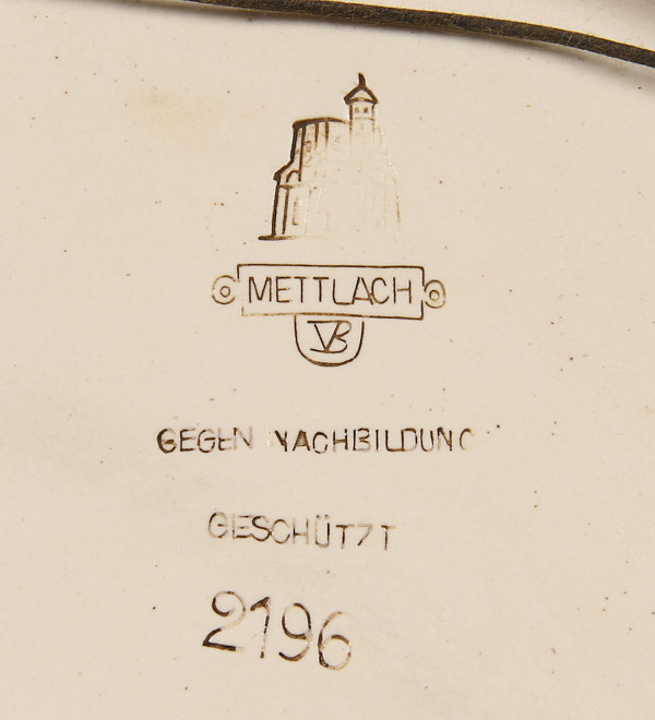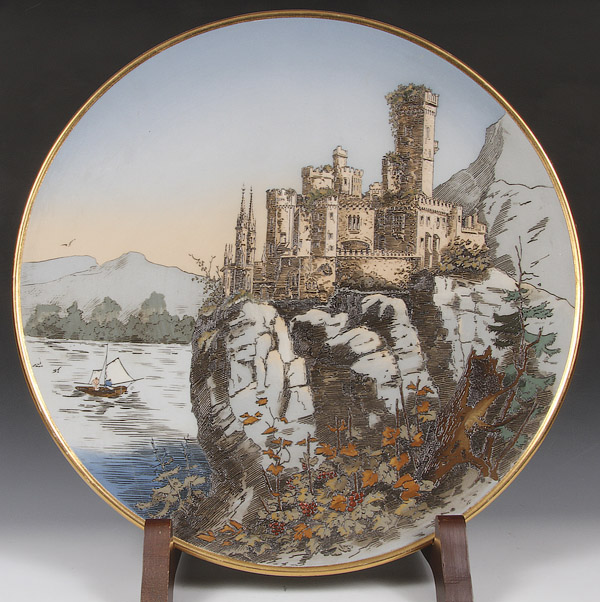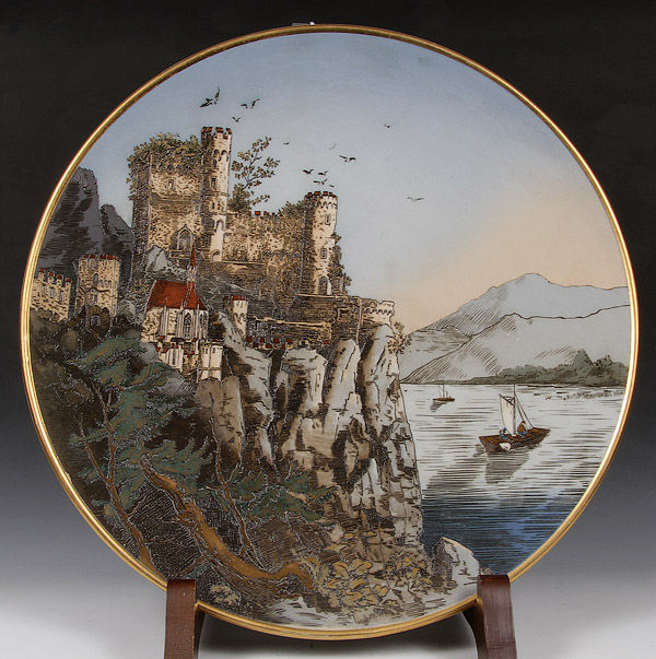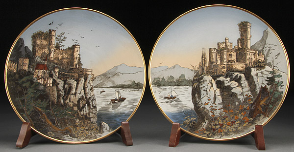 A PAIR OF METTLACH CERAMIC PLAQUES, CIRCA 1900. Each with castles on a cliff, depicting Rheinstein and Stolzenfels. Embossed marks on verso. Diameter 17.5 inches (44.5 cm).