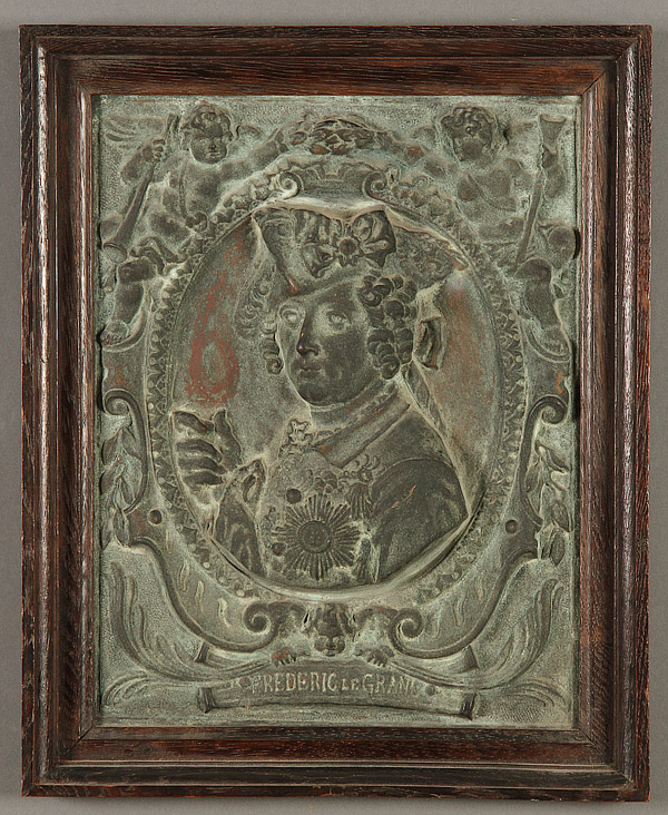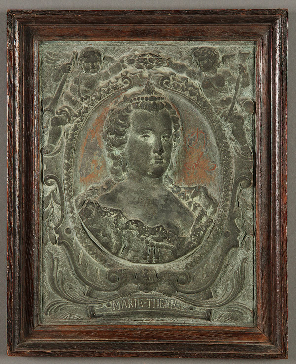 A PAIR OF REPOUSSE COPPER PLAQUES OF MARIE TERESA AND FREDERICK THE GREAT, 19TH CENTURY. Each contained in an oak frame and with considerable verdi gras oxidation, 18 inches x 14.5 inches (45.75 x 36.8 cm).