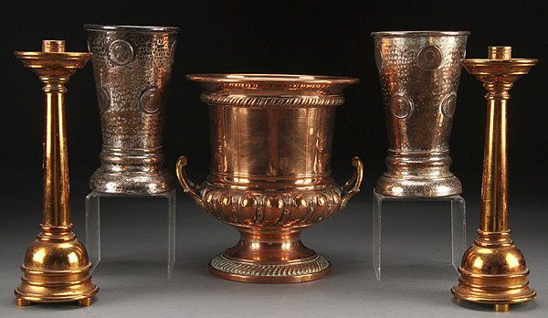 AN ENGLISH COPPER TABLEWARES GROUP, 19TH CENTURY. Comprising a pair of Wager-Beakers with applied 1806 and 1807 copper pennies, the glazed bases containing three dice. Together with a pair of Arts and Crafts style candlesticks marked "Gunning & Son, Dublin" and an early wine cooler with silvering removed. The largest height 11.5 inches (29 cm).