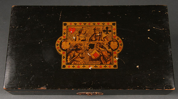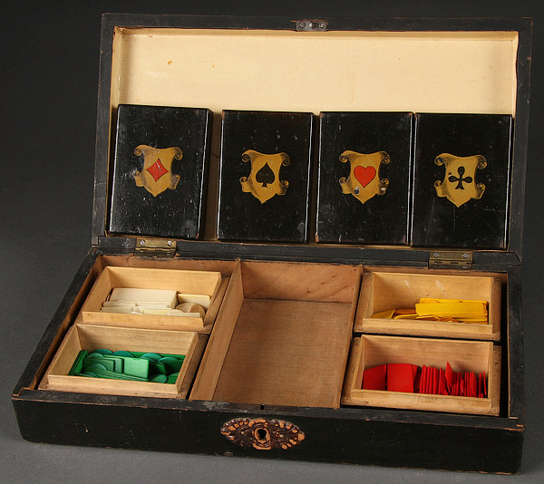 A SET OF 19TH CENTURY POLYCHROME IVORY GAME MARKERS. Of flat rectangular, circular and square shape, in stained colors of green, yellow, red and natural ivory. Each contained in black lacquered individual boxes decorated with playing cards suites and further contained in a fitted box. The lid decorated with playing card motif. Length 10.75 inches (27 cm).