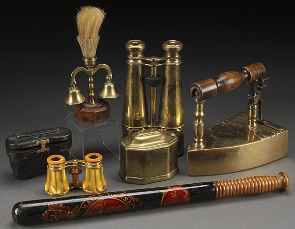 A 19TH CENTURY DECORATIVE ARTS GROUP. Six pieces comprising a Parker Holborn English police baton with polychrome coat of arms, a pair of brass binoculars marked "Hughes & Son, London," a pair of fine French gilt bronze and mother of pearl opera glasses in leather case, a bronze tea canister, a pair of brass hame bells with ornamental brush and an early Dutch brass clothes iron. The longest 18.25 inches (46.5 cm).