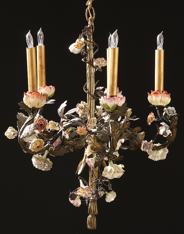 A LOUIS XVI STYLE GILT BRONZE AND PORCELAIN FLORAL CHANDELIER, CIRCA 1900. With five scrolled foliate candle sockets and extending hand molded floral blossoms. Height 22 inches (55.9 cm).