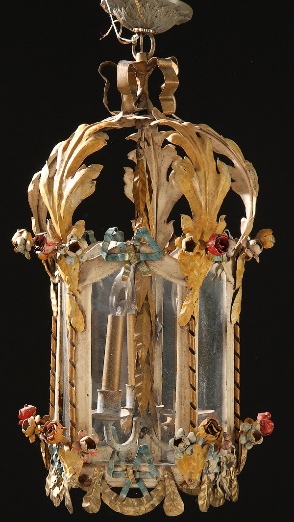 A POLYCHROME TIN FLORAL DECORATED PENDANT LAMP. With pentagon glazed panels and extending foliate decoration. Length 24 inches (61 cm).