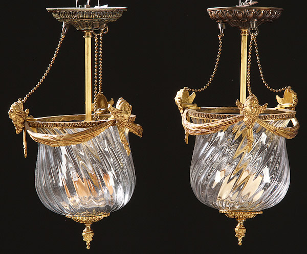 A PAIR OF CONTEMPORARY FRENCH GILT BRONZE NEOCLASSIC STYLE HALL LAMPS. With winged facial masked supports above a swirl ribbed crystal shade with three electric candle lamps. Height 16.25 inches (41 cm).