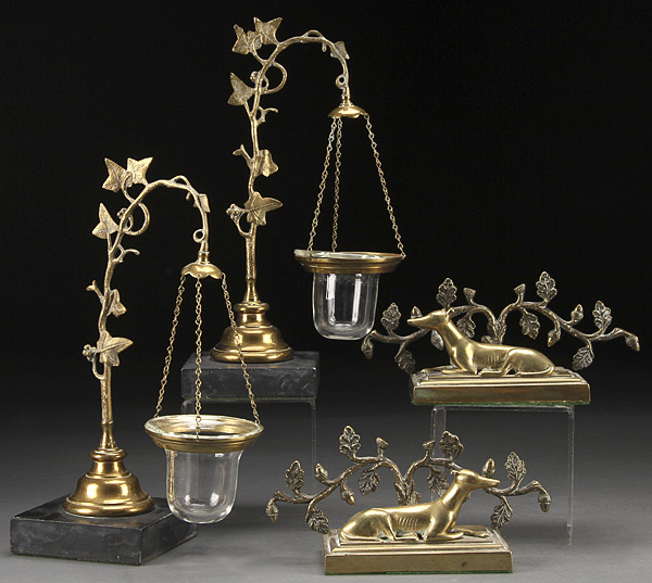 A PAIR OF ENGLISH VICTORIAN GILT BRONZE GREYHOUND ORNAMENTS, MID 19TH CENTURY. With scrolling acorns and leaves. Together with a matching pair of gilt bronze and crystal fairy lamps supported from scrolled vine shaped armatures. The largest 11.5 inches (29 cm).