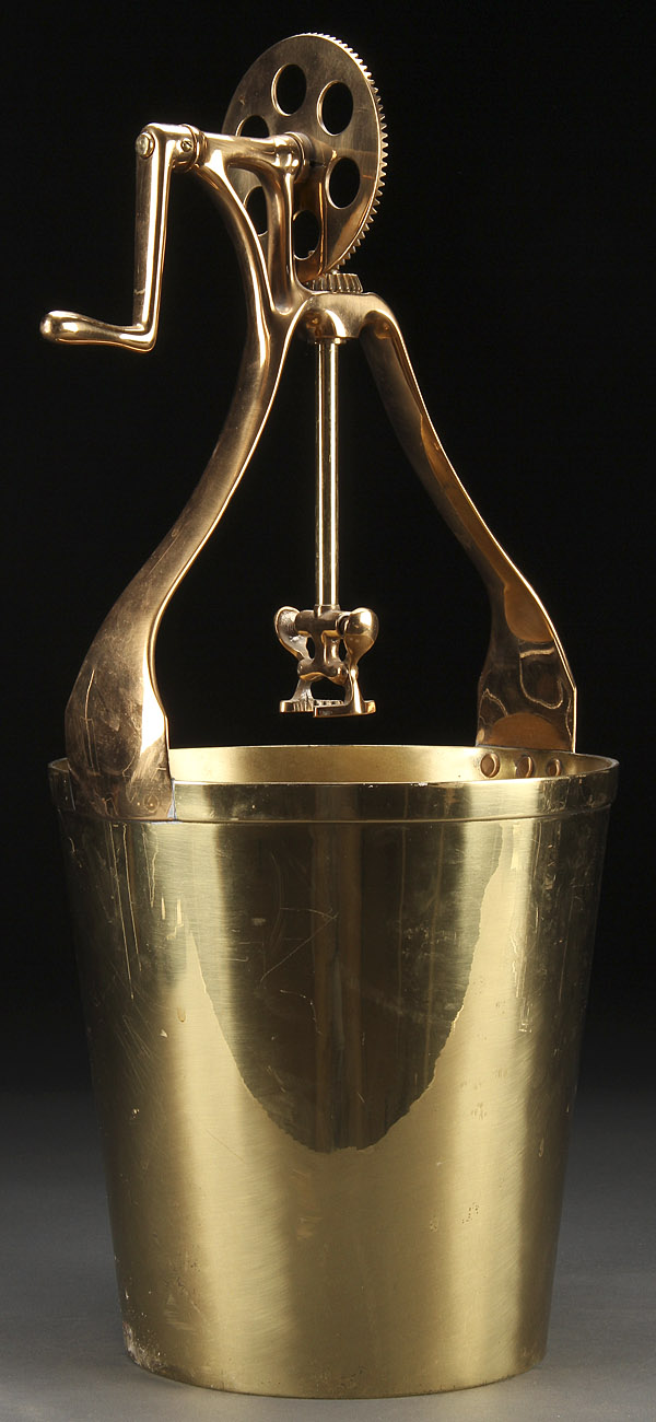 A BRASS AND BRONZE MECHANICAL CHAMPAGNE COOLER, EARLY 20TH CENTURY. With geared crank mechanism above a tapering bucket. Apparently unmarked. Height 21.25 inches (54 cm).