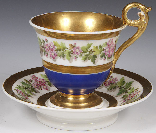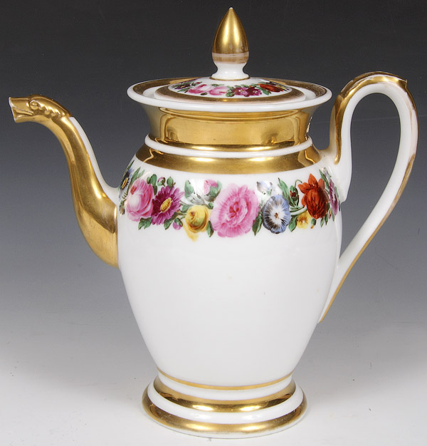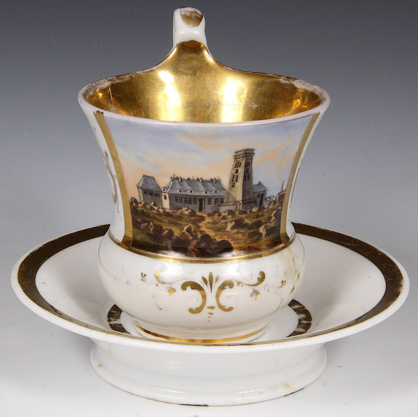 TWO FINE FRENCH OLD PARIS PORCELAIN TEAPOTS, EARLY 20TH CENTURY. One with hand painted florals, one with hand painted coastal scenes, together with two cups and saucers including a German topographical scene. The largest 8.25 inches (21 cm).